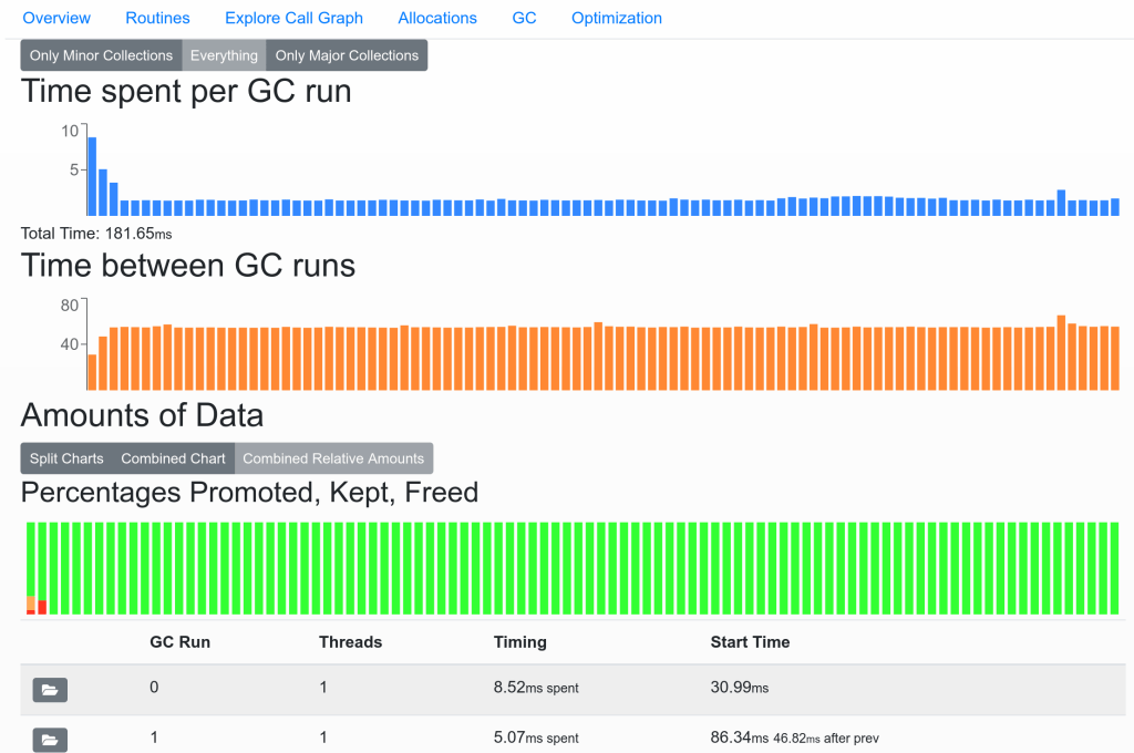 You can check if some runs are very long, if the runs are too frequent and finally the way the “cells” are managed (the items have a “lifetime” called “generational garbage collection” where items move from one space to another and change their “state”)