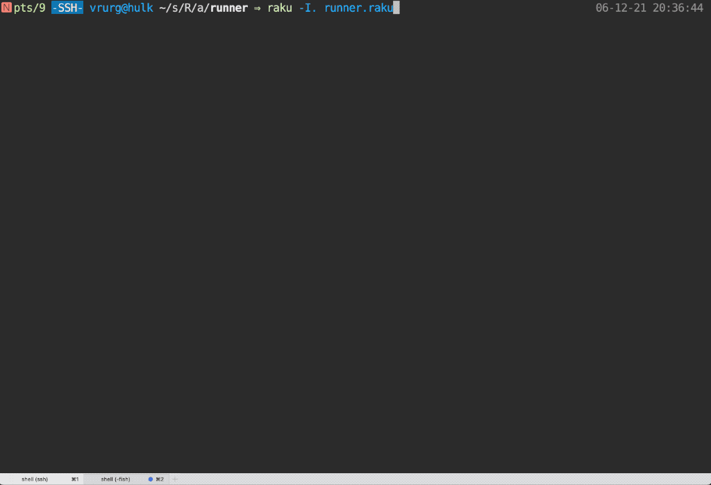 But once there was a day when I thought: perhaps there is a module for parsing ANSI sequences? And thrown I a dragnet into the waters of Raku Land, and came it back empty, and made I a helpless gesture… Only to see in two days an announcement of Geoffrey Broadwell releasing his Terminal::ANSIParser! It was the sign. After all, having something for UI, something for parsing the input, and an already working process orchestrator – how long would it take to forge them into something? Yes, my naïvety again and again. Once started, I wanted to get from it:
