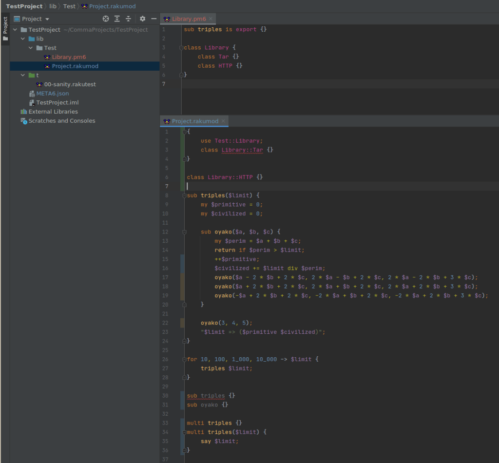 Here we have two files, Library.pm6 and Project.rakumod. One declares a subroutine available for importing and a couple of classes. The second one has quite a lot going on, so let’s go step by step.