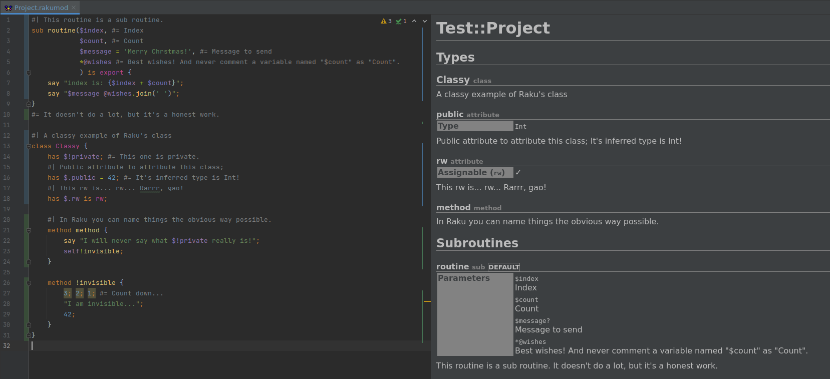 In the preview tab on the right of the editor we see rendered HTML generated from the Pod in the editor. Generated documentation is for things that are visible externally, such as packages (classes are packages) or exported subroutines. Items are divided into categories Types and Subroutines. For a Raku entity which can carry documentation, the documentation lines are merged into a single description.