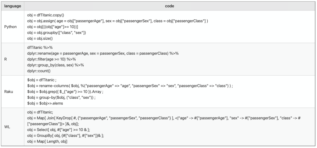 ==> {rename-columns($_, %(passengerAge => 'age', passengerSex => 'sex', passengerClass => 'class')) }()